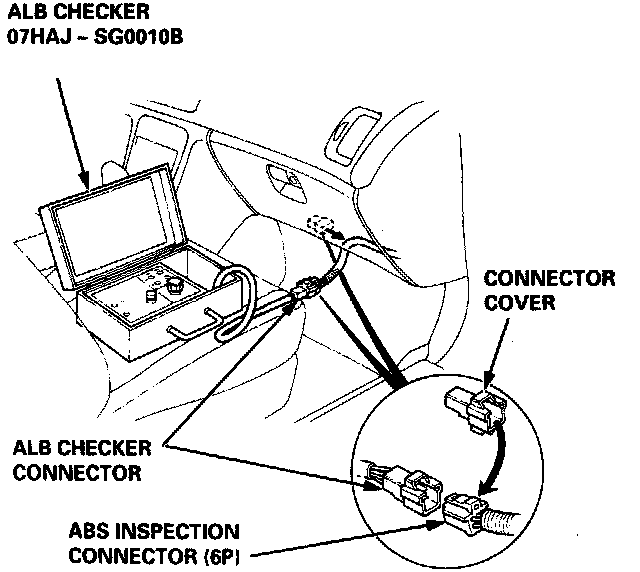 4. With the ignition switch OFF, disconnect the ABS inspection connector (6P) from the connector cover located under the glove box, and connect it to the ALB checker.