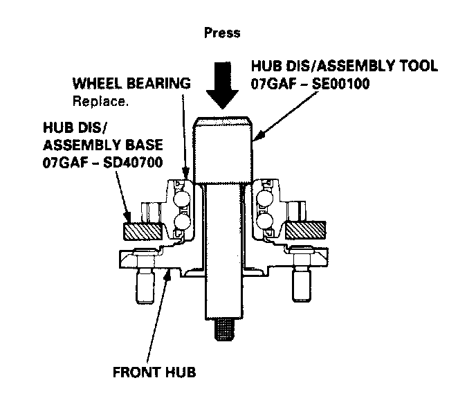 4. Separate the wheel bearing from the front hub using the special tools and a press as shown.