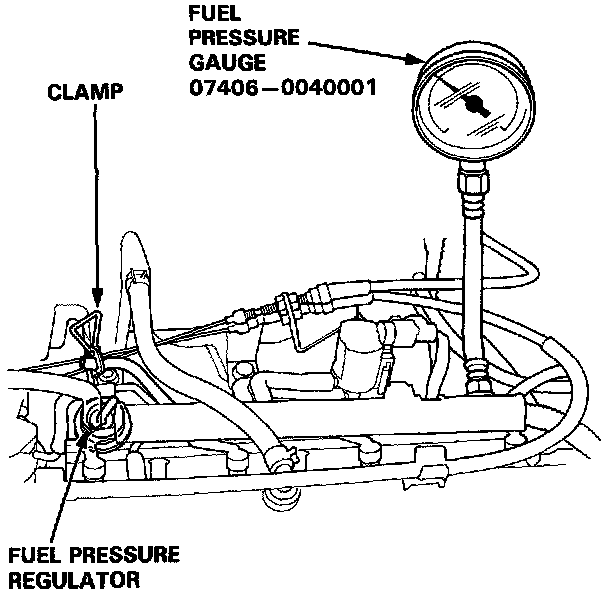 3. Start the Engine. (If the Engine will not start, turn the Ignition Switch on, wait for two seconds, turn it off, then back on again and read the Fuel Pressure). Measure the fuel pressure with the Engine idling and the Vacuum Hose of the Fuel Pressure Regulator disconnected from the Fuel Pressure Regulator and pinched.
