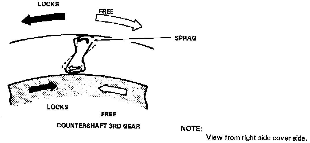 The one-way clutch is positioned between the countershaft 1st gear and 3rd gear, with the 3rd gear splined to the countershaft. The 1st gear provides the outer race surface, and the 3rd gear provides the inner race surface. The one-way clutch locks up when power is transmitted from the mainshaft 1st gear to the countershaft 1st gear. The 1st clutch and gears remain engaged in the 1st, 2nd, 3rd, and 4th gear ranges in the D4, D3 or 2 position. However, the one-way clutch disengages when the 2nd, 3rd, or 4th clutches/gears are applied in the D4, D3 or 2 position. This is because the increased rotational speed of the gears on the countershaft overrides the locking "speed range" of the one-way clutch. Thereafter, the one-way clutch free-wheels with the 1st clutch still engaged.