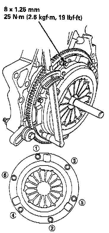 4. Torque the mounting bolts in a crisscross pattern as shown. Tighten the bolts in several steps to prevent warping the diaphragm spring.
