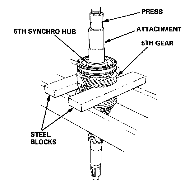 CAUTION: Remove the synchro hubs using a press and steel blocks as shown. Use of a jaw-type puller can cause damage to the gear teeth.