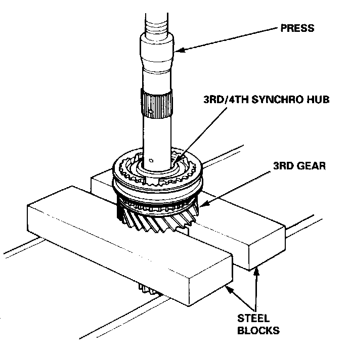 3. In the same manner as above, support the 3rd gear on steel blocks, and press the mainshaft out of the 3rd/4th synchro hub, as shown.