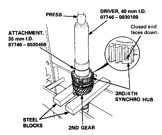 1. Support 2nd gear on steel blocks, then install the 3rd/4th synchro hub using the special tools and a press, as shown.