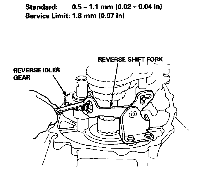 3. Measure the clearance between the reverse idler gear and reverse shift fork.
