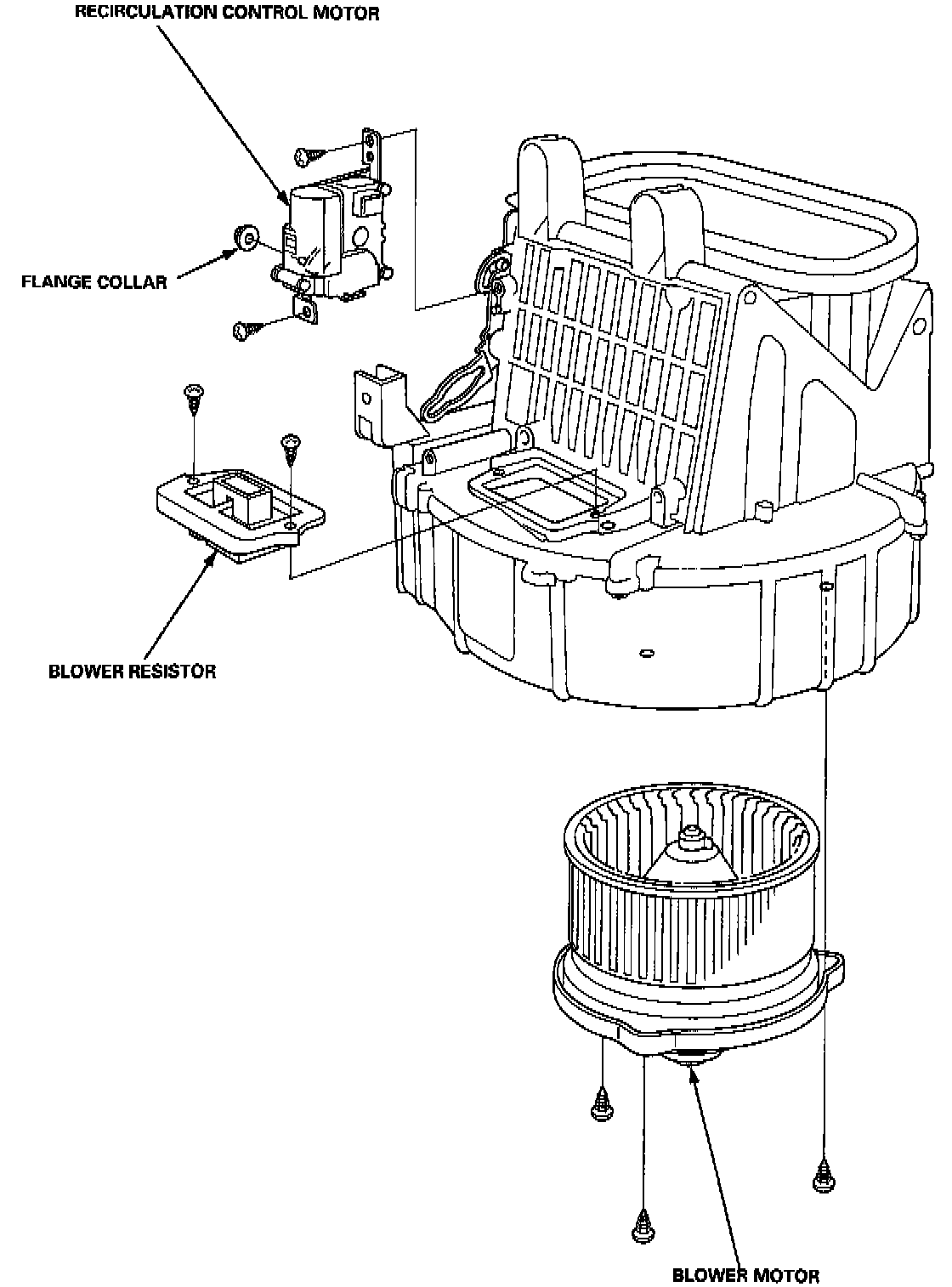 The blower motor, recirculation control motor and blower resistor can be replaced without removing the blower unit. Disconnect the connector from the blower resistor, remove mounting screws, remove resistor. Reverse steps to install.