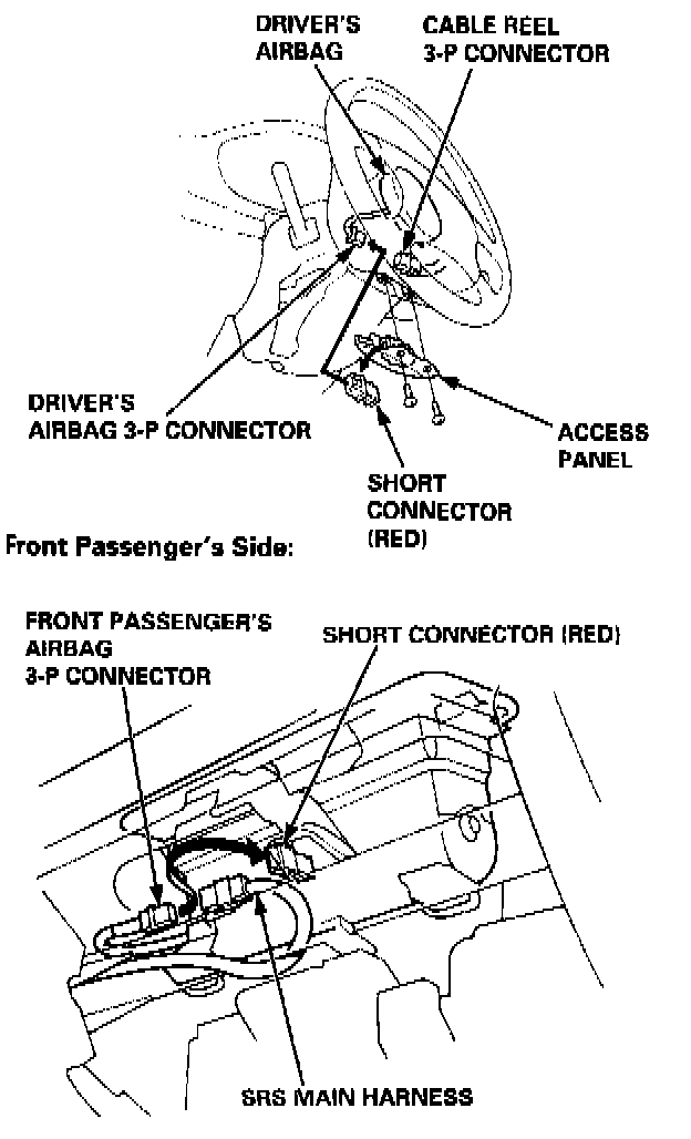 - Before disconnecting any part of the SRS wire harness, connect the short connectors (RED) to the airbags.