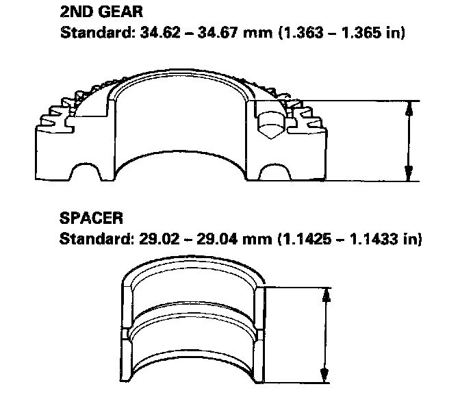 - If the thicknesses of 2nd gear and spacer are less than the standard, replace with a new one.