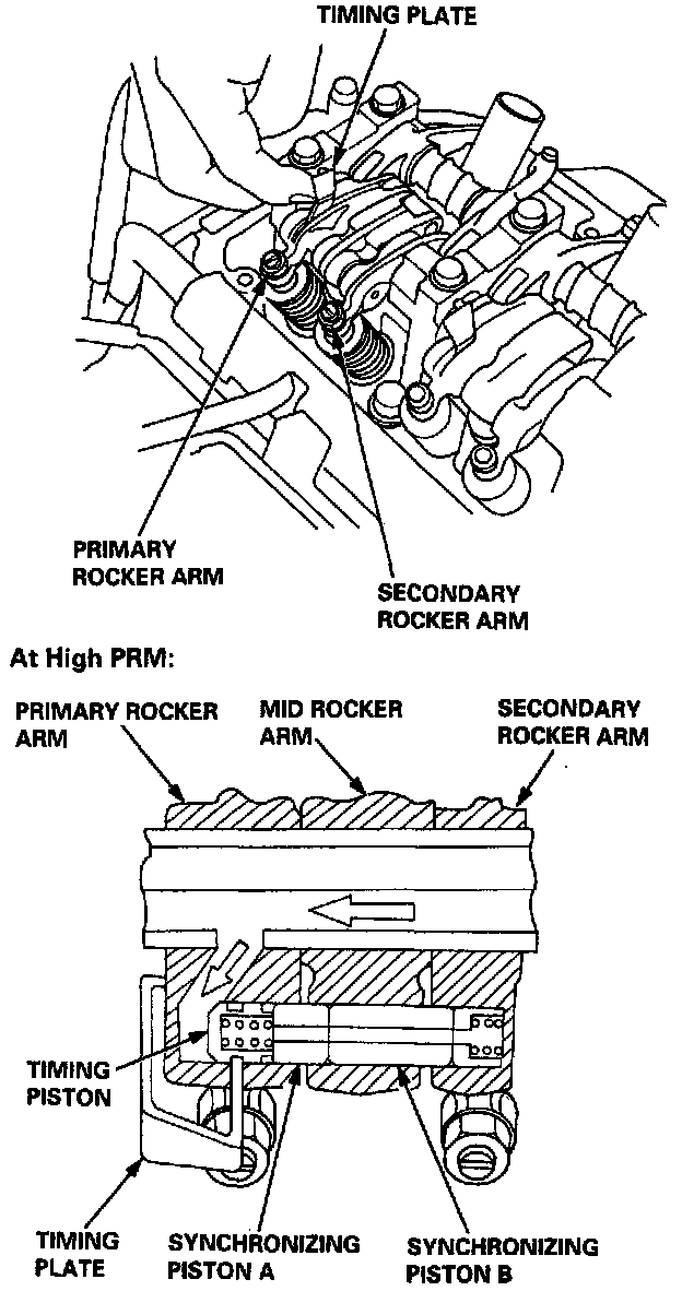 - The synchronizing piston can be seen in the gap between the mid, secondary and primary rocker arms.