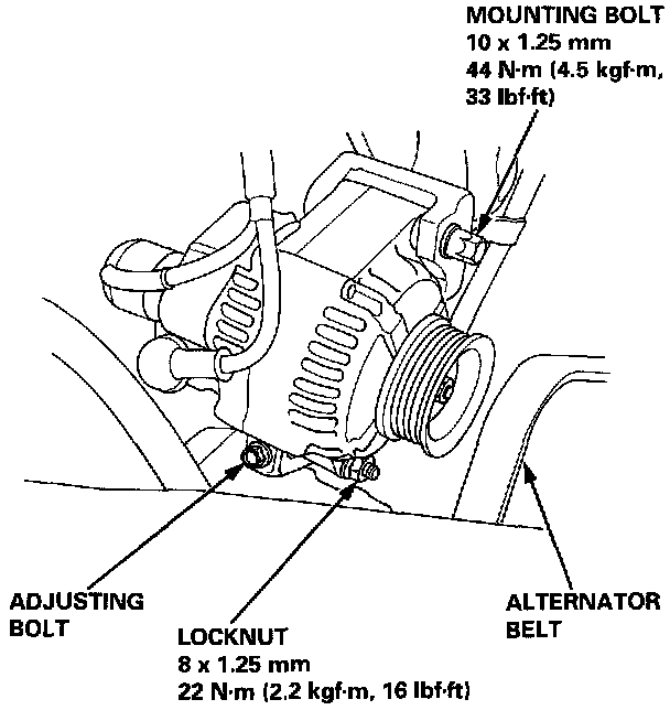4. Loosen the adjusting bolt, mounting bolt and locknut, then remove the alternator belt.