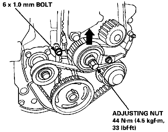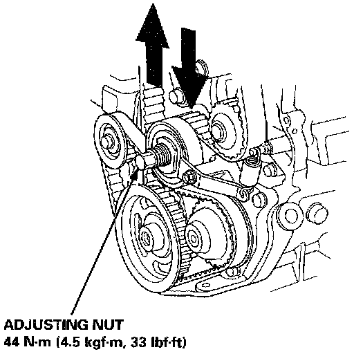 - Loosen the adjusting nut 2/3 - 1 turn. Push the tensioner to remove tension from the timing balancer belt, then retighten the adjusting nut.