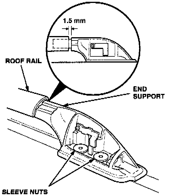 1. Measure the distance between the end of the roof rail and the shoulder on the end support. It should be 1.5 mm. Without this clearance, you will not be able to slide the cover on far enough to fully engage the lock.