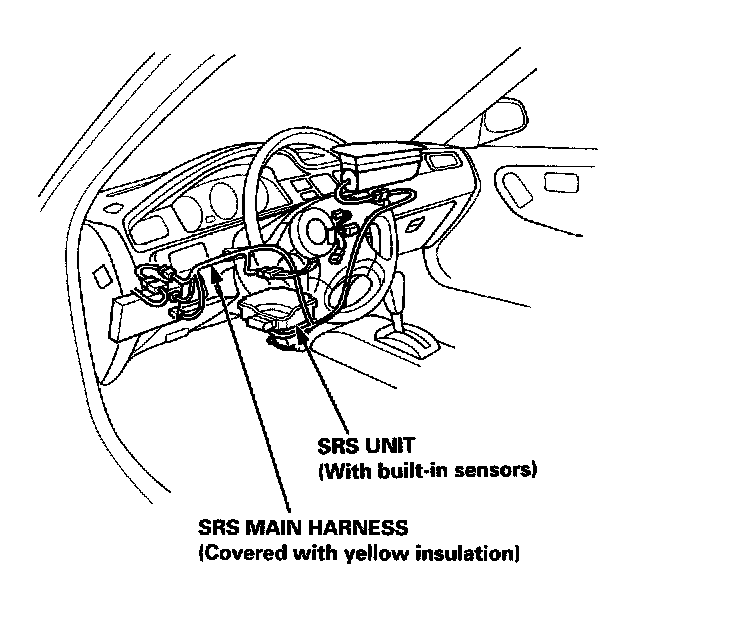 CAUTION: All SRS wire harnesses are covered with yellow insulation. Before you disconnect any part of an SRS wire harness, connect the short connectors. Whenever the ignition switch is ON (II), or has been turned OFF for less than three minutes, be careful not to bump the SRS unit; the airbags could accidentally deploy and cause damage or injuries.
