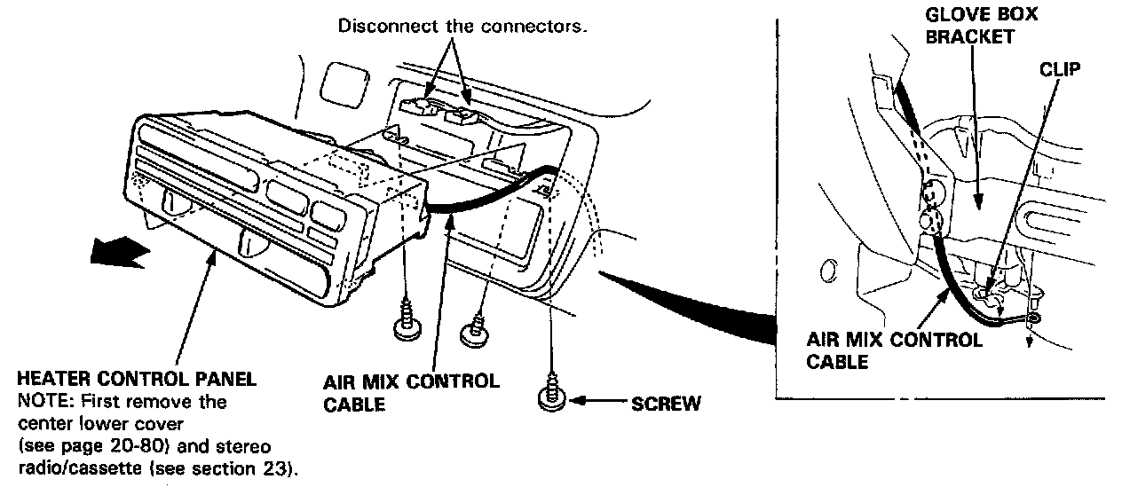 6. Disconnect the air mix control cable from the heater unit.