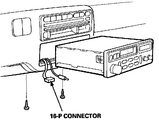 5. Remove the two screws, then disconnect the 16-P connector and the antenna lead, and pull out the radio/cassette player.