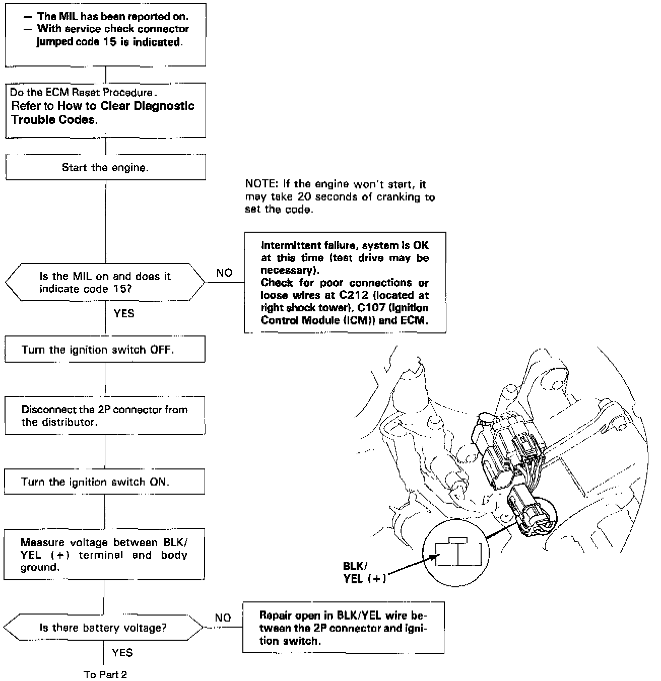 The Malfunction Indicator Lamp (MIL) indicates Diagnostic Trouble Code (DTC) 15: A problem in the Ignition Output Signal circuit.