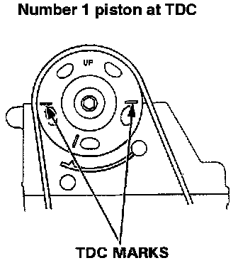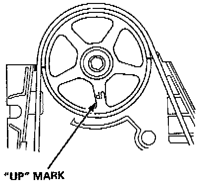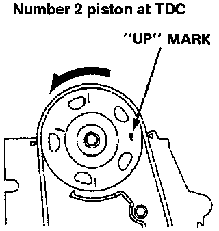 2. Set the No. 1 piston at TDC. "UP" mark on the camshaft pulley should be at top, and TDC marks should align with the cylinder head surface. The crankshaft pulley should be at TDC.
