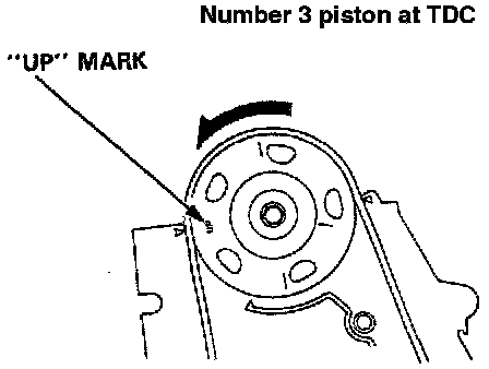 6. Rotate the crankshaft 180° counterclockwise (camshaft pulley turns 90°). The "UP" mark should be on the exhaust side. Adjust valves on No. 3 cylinder.