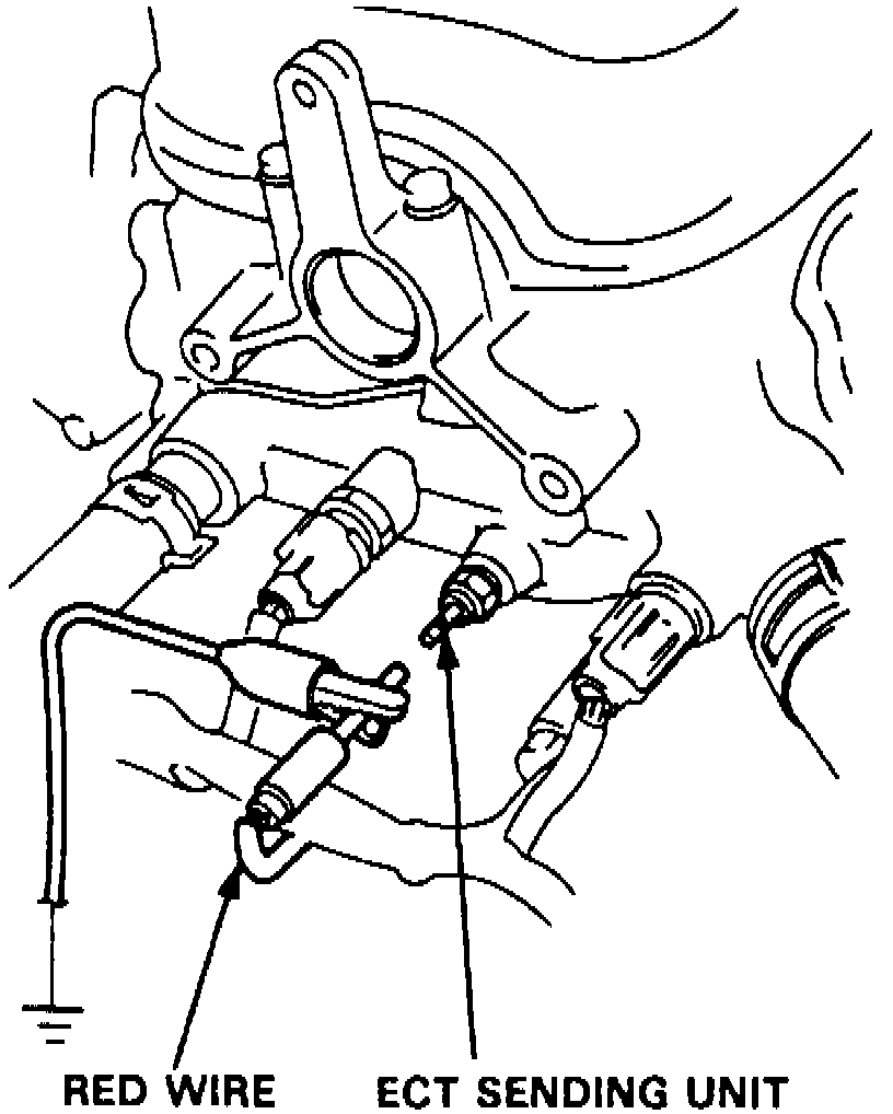 2. Ensure ignition switch is in Off position, then disconnect yellow/green wire from coolant temperature sending unit, Fig. 1, and ground it with a jumper wire.