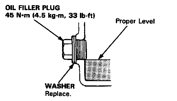 2. The oil level must be up to the filler hole. If it is below the hole, add oil until it runs out, then reinstall the oil filler plug.