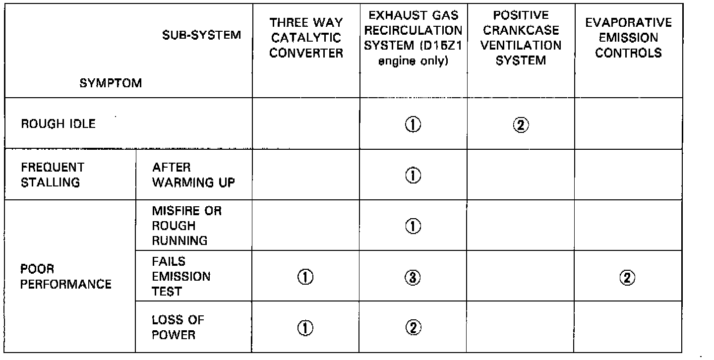 NOTE: Across each row in the chart, the sub-systems that could be sources of a symptom are ranked in the order they should be inspected starting with [1]. Find the symptom in the left column, read across to the most likely source, then refer to the page listed at the top of that column. If inspection shows the system is OK, try the next most likely system [2] etc.