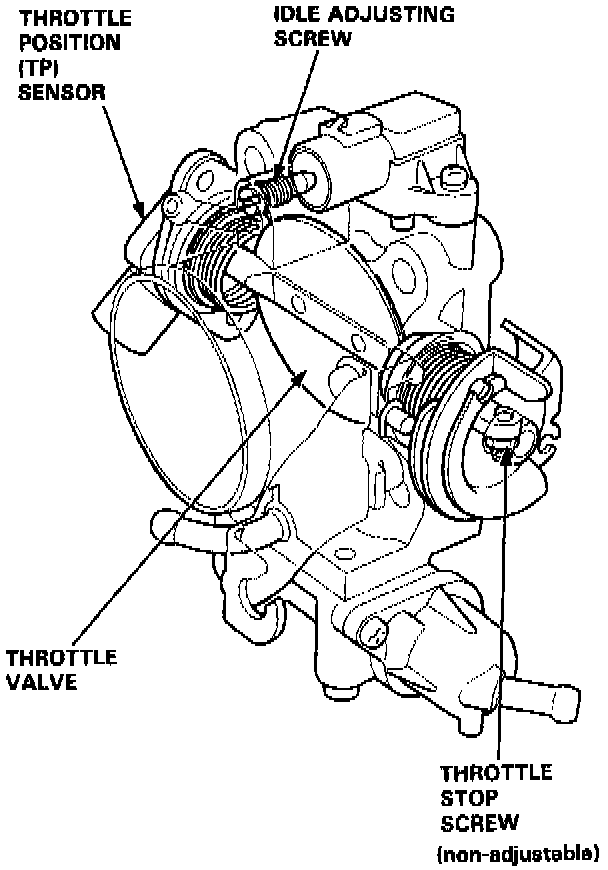 The throttle body is of the single-barrel side-draft type. The lower portion of the throttle valve is heated by engine coolant which is fed from the cylinder head. The idle adjusting screw which increases/decreases bypass air and the evaporative emission (EVAP) control canister port are located on the top of the throttle body.