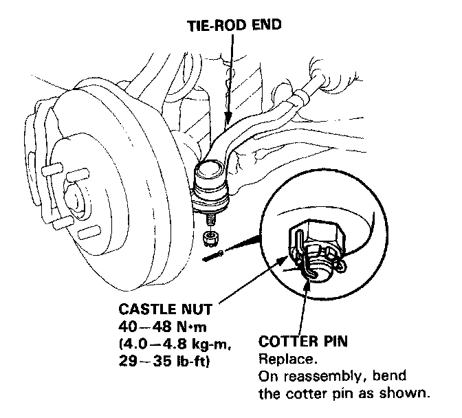8. Reconnect the tie-rod ends to the steering knuckles, tighten the castle nut to the specified torque, and install new cotter pins.