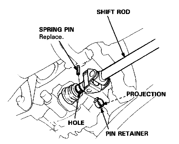 - Connect the shift rod to the transmission and drive the spring pin with a punch, then install the pin retainer. Be sure that the projection on the pin retainer is in the hole.
