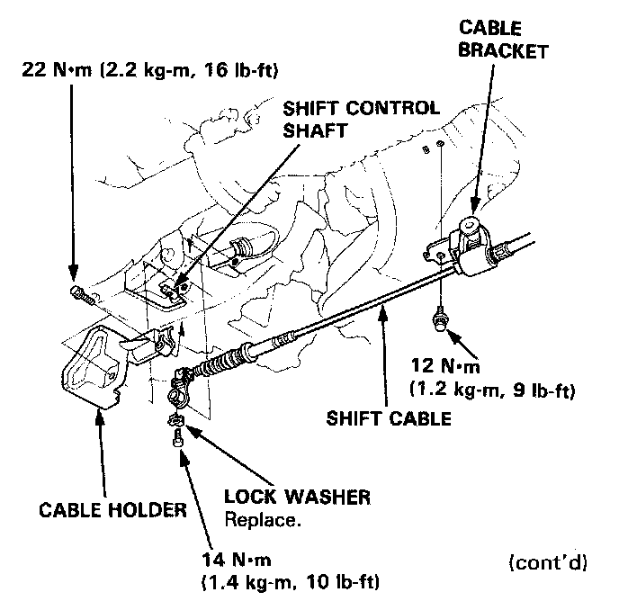 - Connect the shift cable end to the shift control shaft, and install the cable bracket.