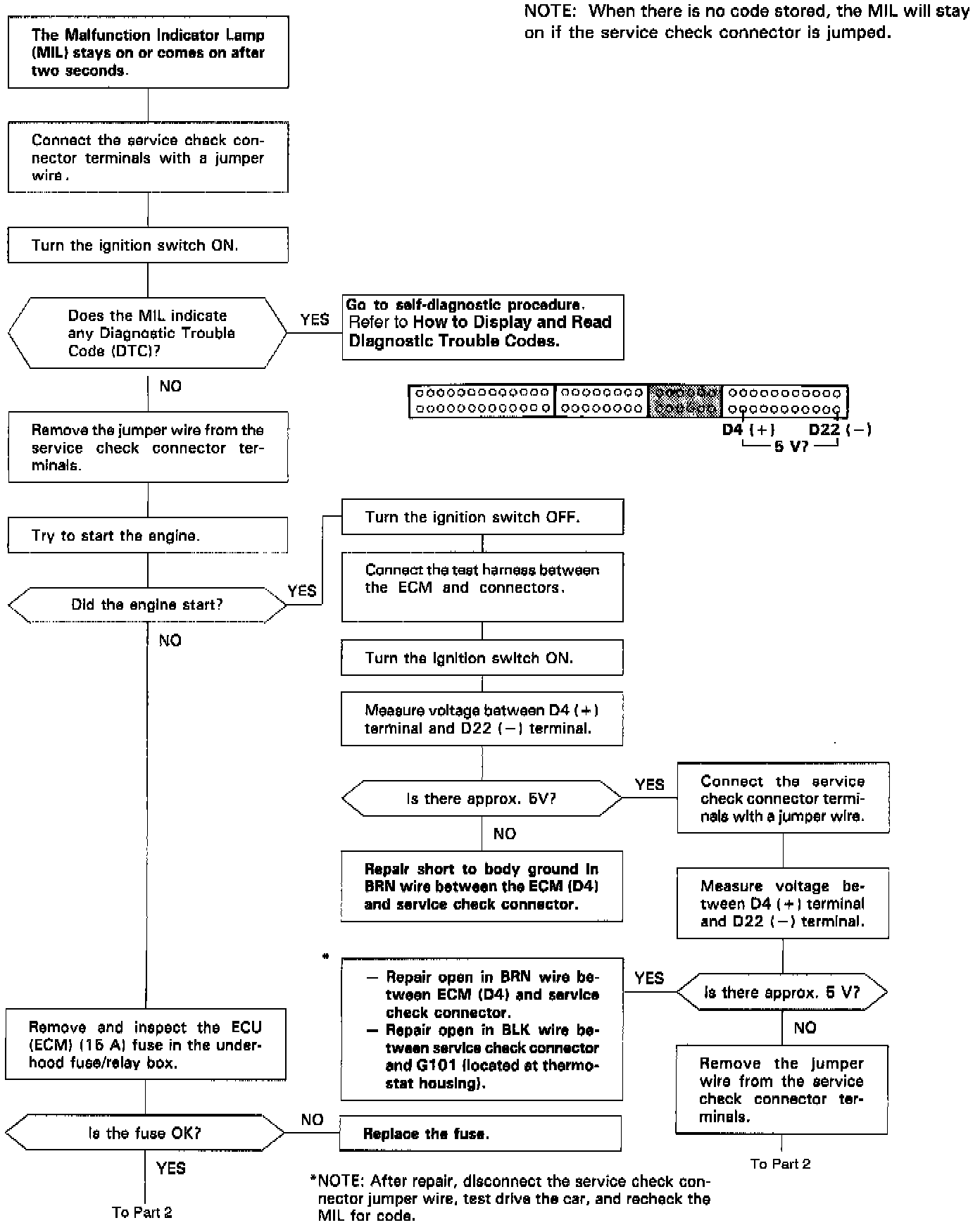 When there is no code stored, the MIL will stay on if the service check connector is jumped.