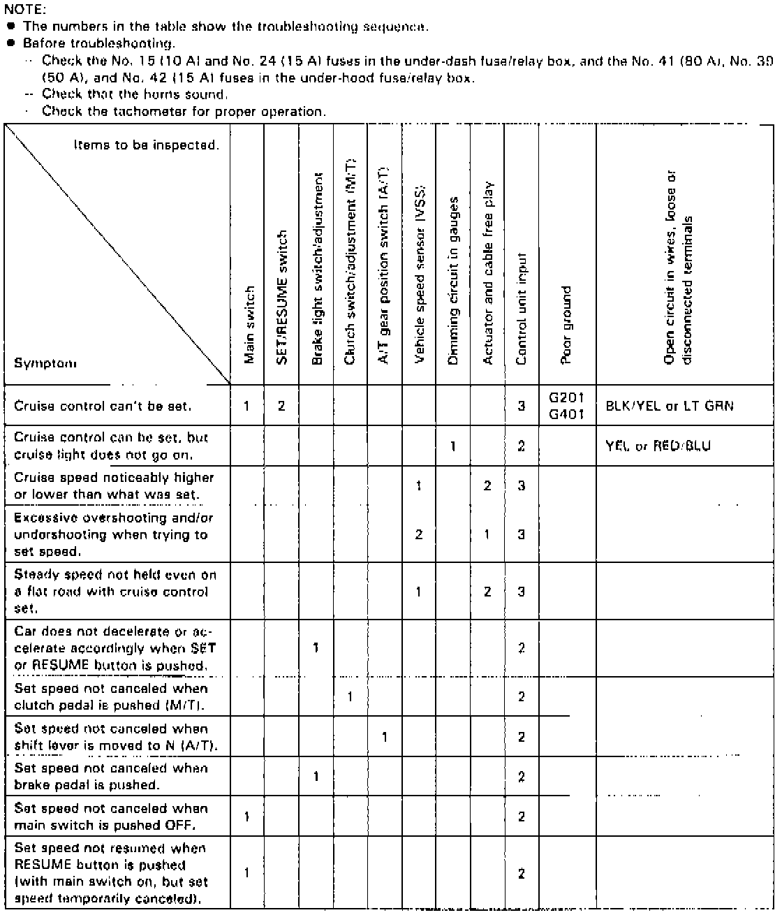Prior to troubleshooting the speed control system, check No. 15 (10A) and No. 24 (15A) or No. 12 (15A) fuses in the fuse box and the No. 41 (80A), No. 39 (50A) and No. 42 (20A) fuses in the relay box. If fuses are operating, ensure horn sounds properly and tachometer functions properly. Refer to troubleshooting sequence, Fig. 4.