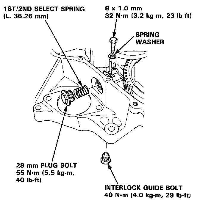 14. Install the 1st/2nd select spring, 28 mm plug bolt, and interlock guide bolt.