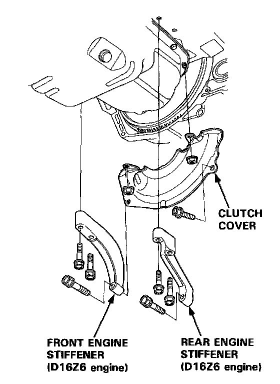 11. Remove the engine stiffeners (D16Z6 engine) and the clutch cover.
