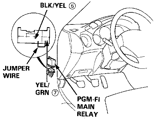 4. Disconnect the Programed Fuel Injection (PGM-FI) Main Relay Connector and connect the BLK/YEL "5" wire and YEL/GRN "7" wire with a Jumper wire.