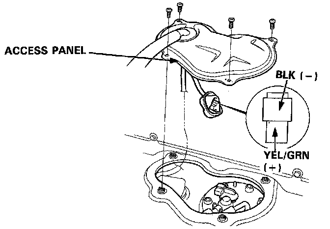 5. Check that Battery voltage is available at the Fuel Pump Connector when the Ignition Switch is turned "ON" (positive Probe to the YEL/GRN wire, negative Probe to the BLK wire).