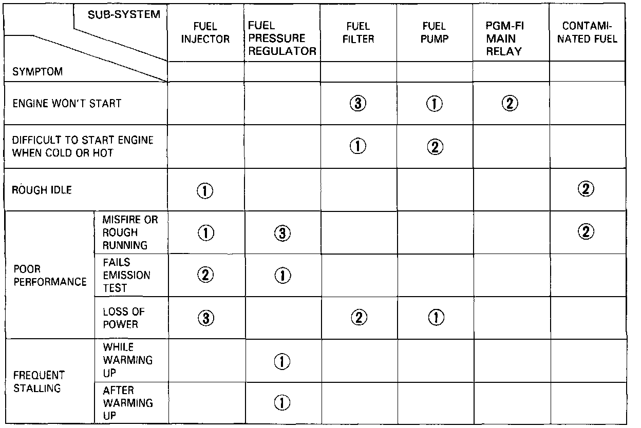 NOTE: Across each row in the chart, the sub-systems that could be sources of a symptom are ranked in the order they should be inspected, starting with "1". Find the symptom in the left column, read across to the most likely source, then refer to that source listed at the top of that column. If inspection shows the system is OK, try the next system "2", etc.