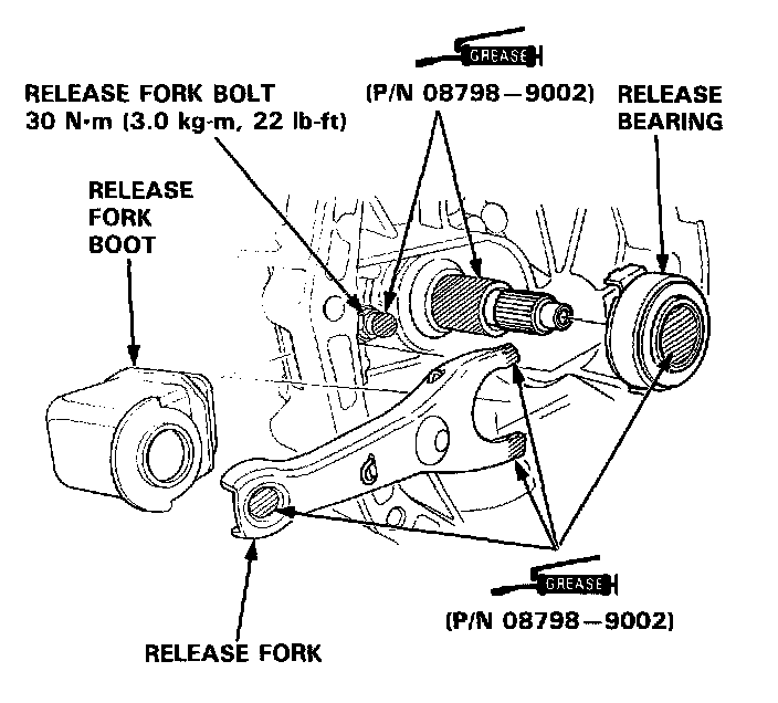 2. Apply grease to the parts as shown then install the release fork and release bearing.