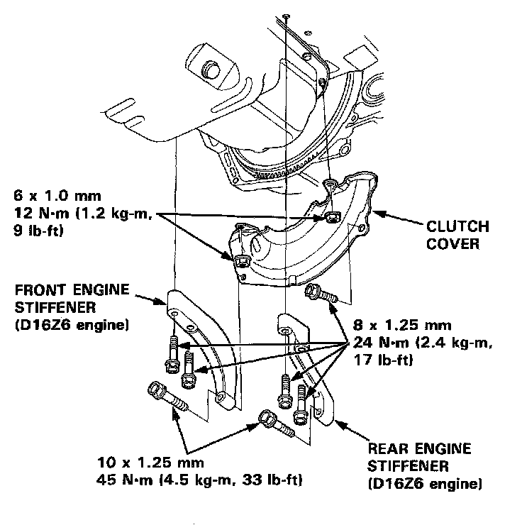 11. Install the clutch cover and the engine stiffeners (D16Z6 engine).