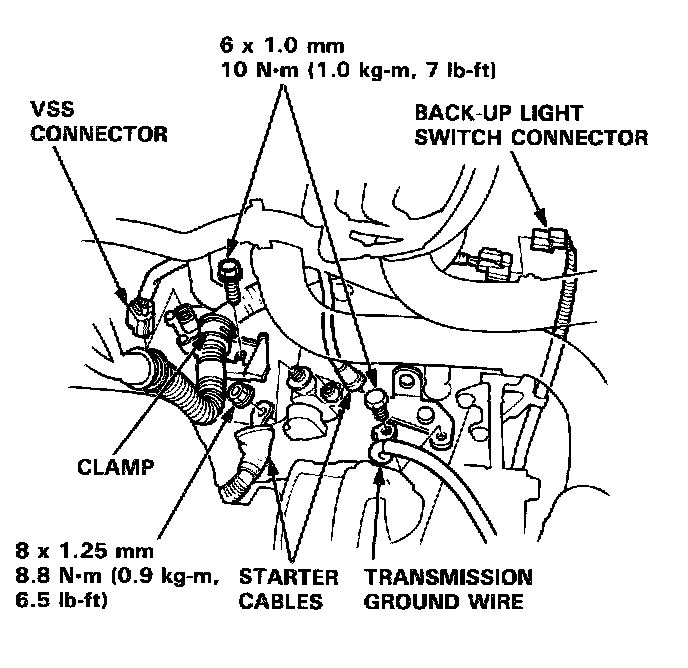 19. Connect the vehicle speed sensor (VSS), back-up light switch connectors, transmission ground wire, and starter cables.