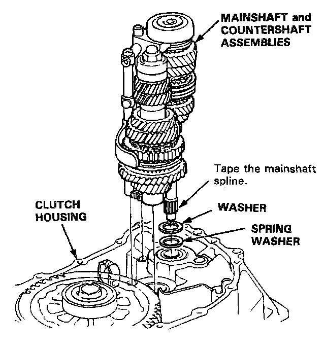 NOTE: Before removing the mainshaft and countershaft assemblies, tape the mainshaft spline to protect it.