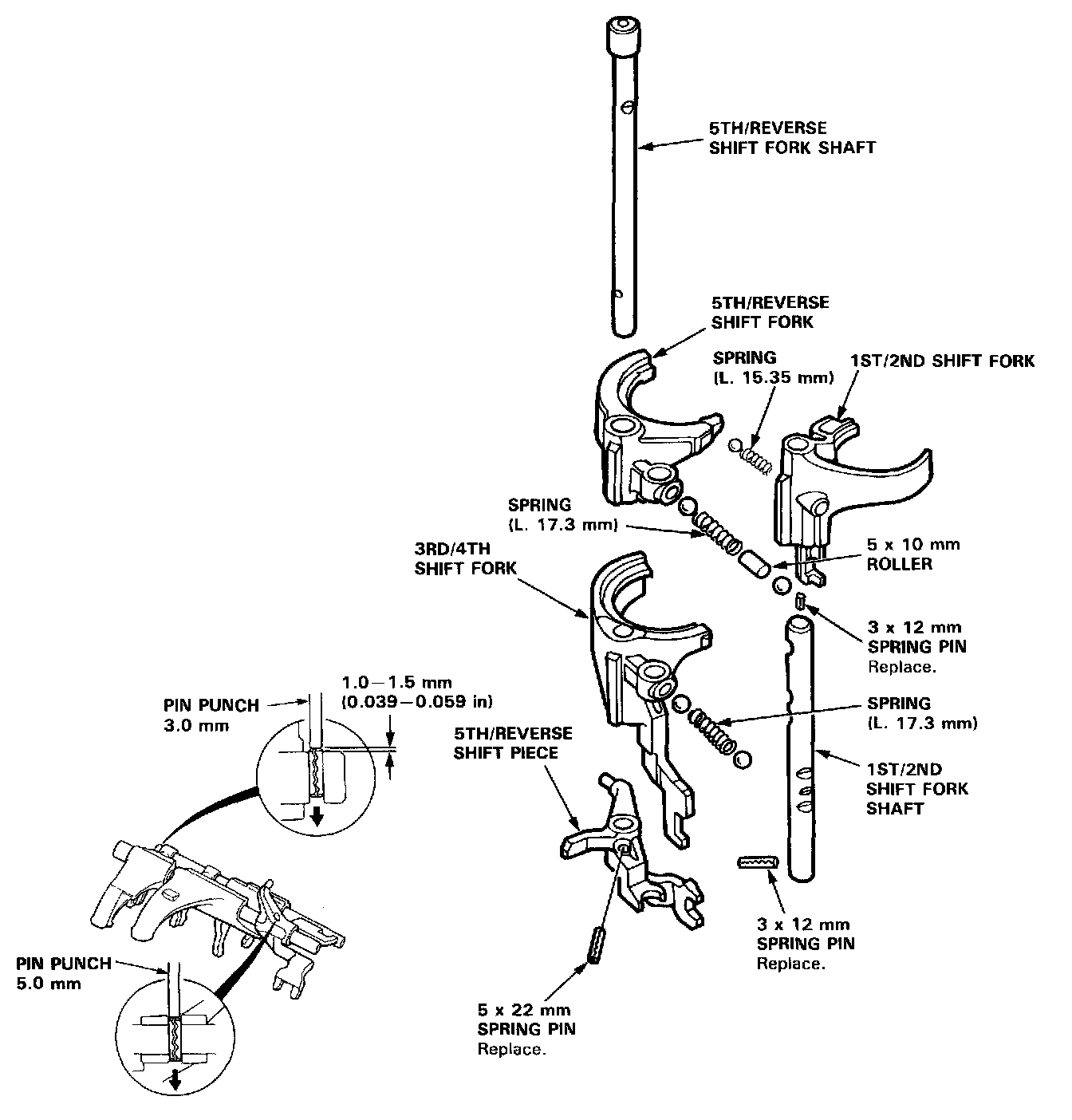 - When assembling, install the shift fork shaft with its detents facing the hole where the balls are inserted.