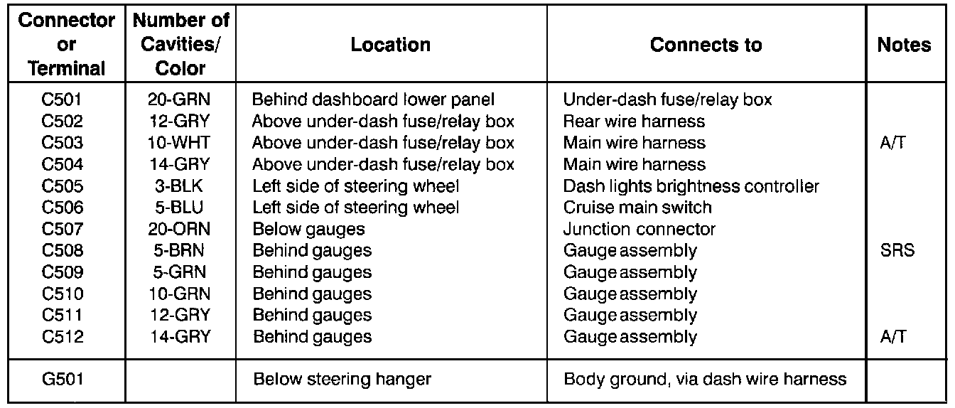 If there is no photo number below or beside a connector, ground, or terminal number, look up that connector, ground, or terminal number in the appropriate Connector Identification Chart. The chart will tell you the color of a connector, how many cavities it has, where it's located, and what component or harness it connects to. Along with this chart you'll find an image giving illustration of the related harness.