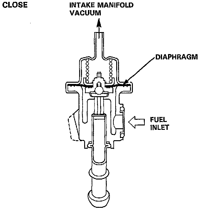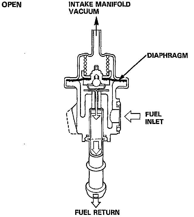 The Fuel Pressure Regulator maintains a constant fuel pressure to the Fuel Injectors. When the difference between the fuel pressure and Manifold pressure exceeds 300 kPa (3.0 kg/cm2, 43 psi), the Diaphragm is pushed upward, and the excess fuel is fed back into the Fuel Tank through the Return Line.