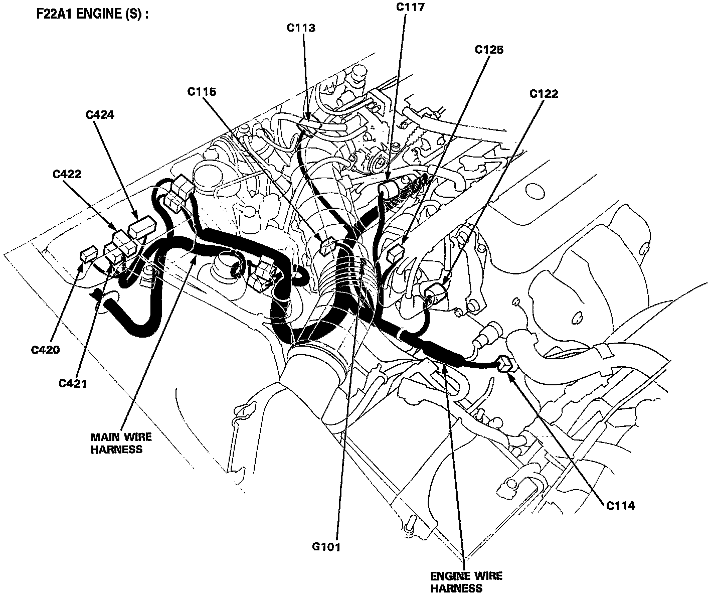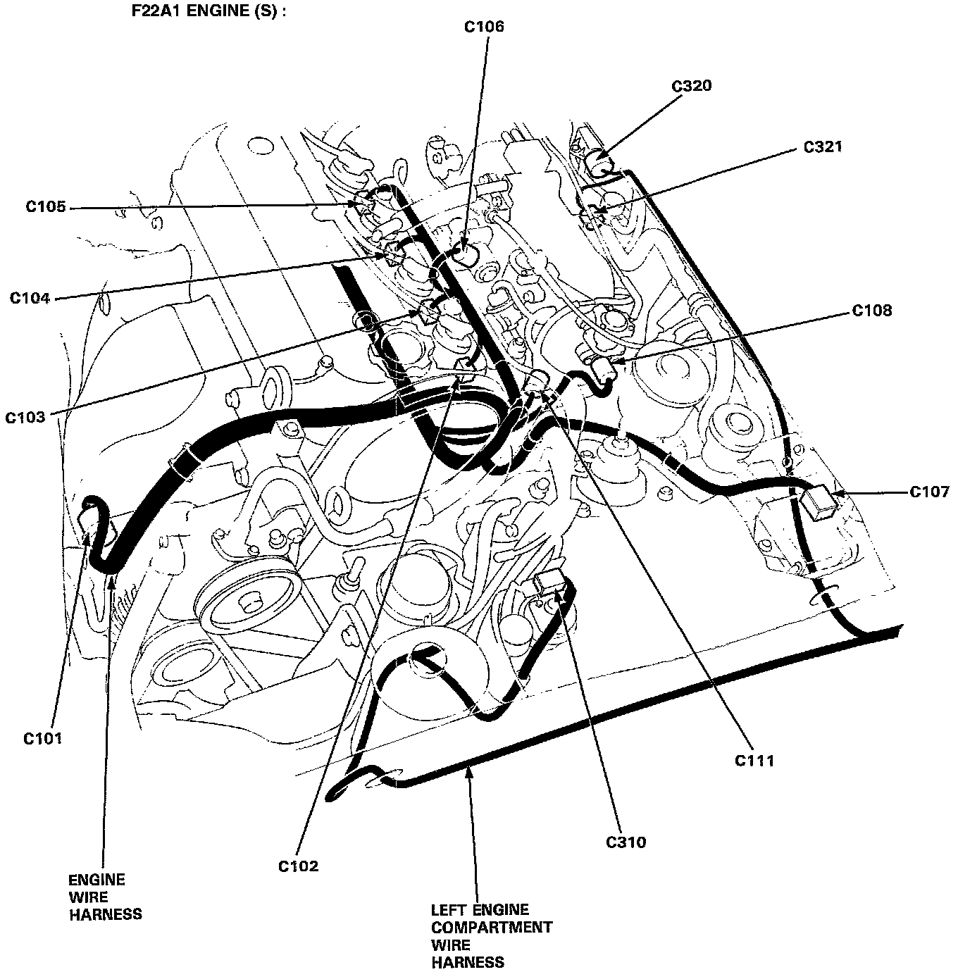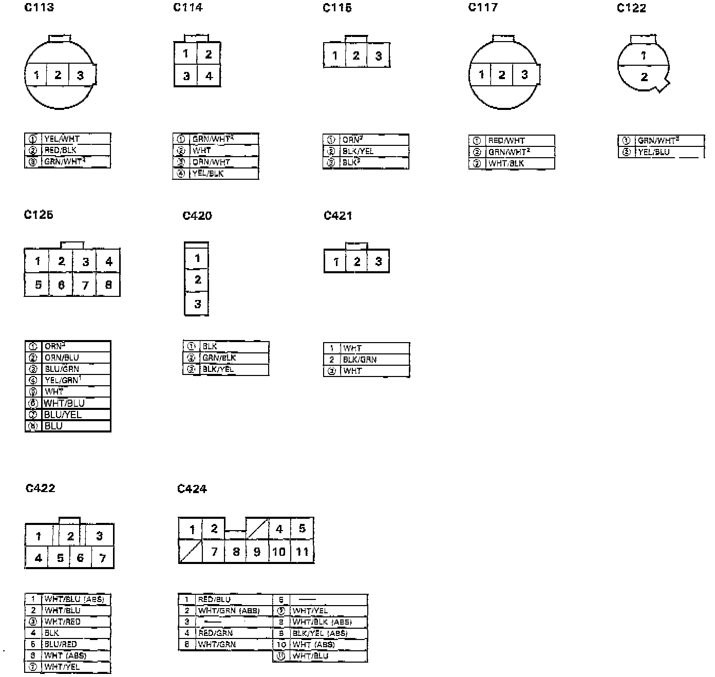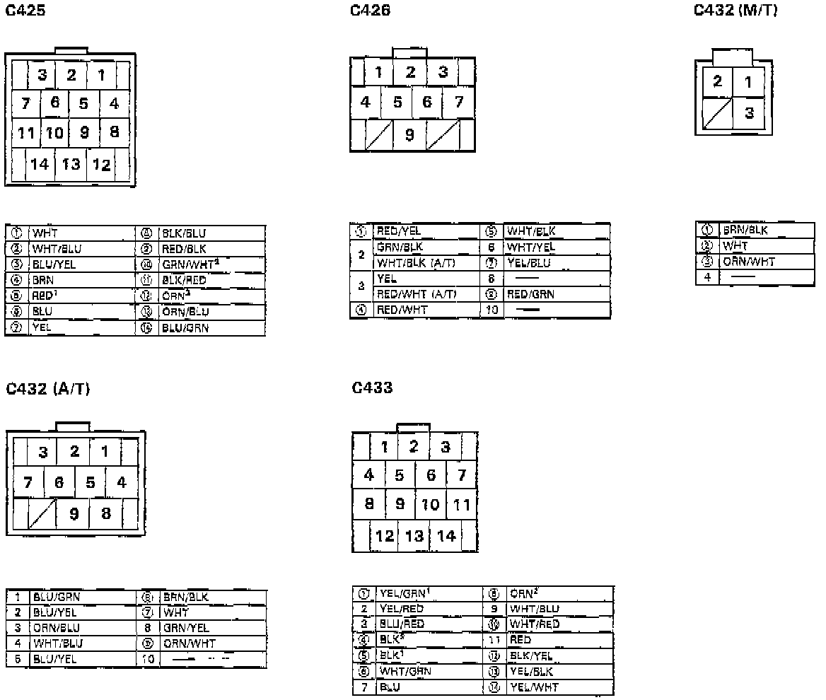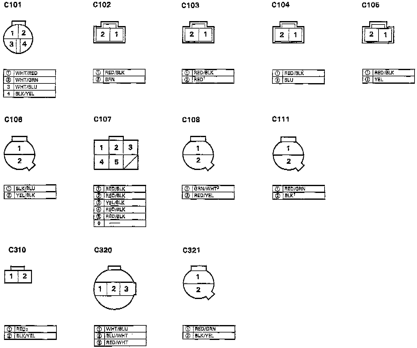 Different wires with the same color have been given a number suffix to distinguish them (for example, YEL/BLK1 and YEL/BLK2 are not the same).