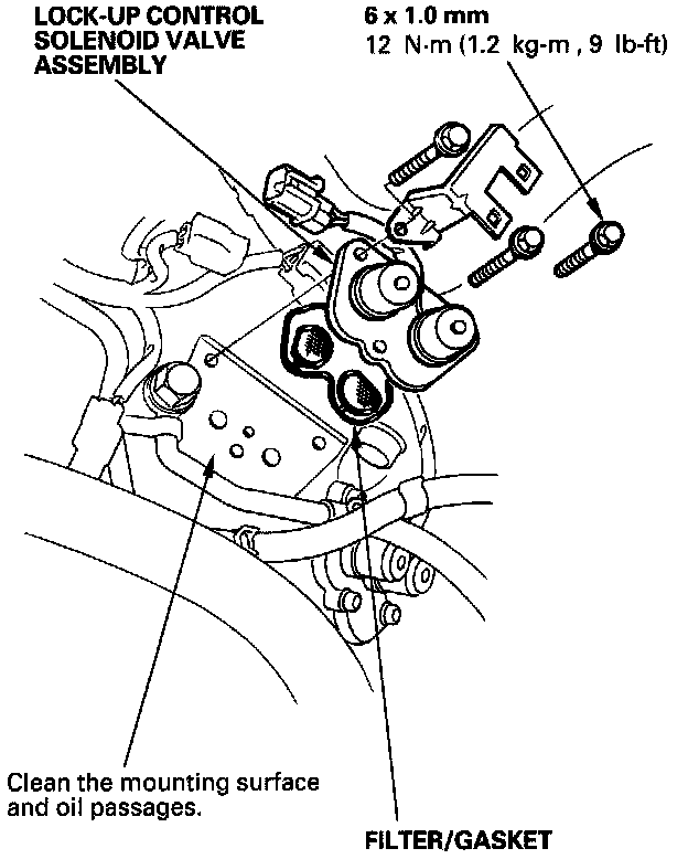3. Clean the mounting surface and oil passages of the lock-up control solenoid valve assembly, and install a new filter/gasket.