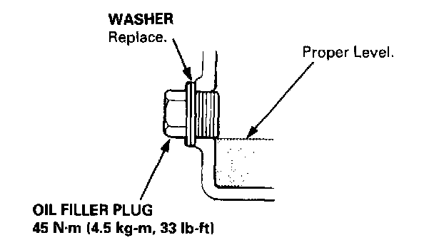 2. The oil level must be up to the filler hole. If it is below the hole, add oil until it runs out, then reinstall the oil filler plug with a new washer.