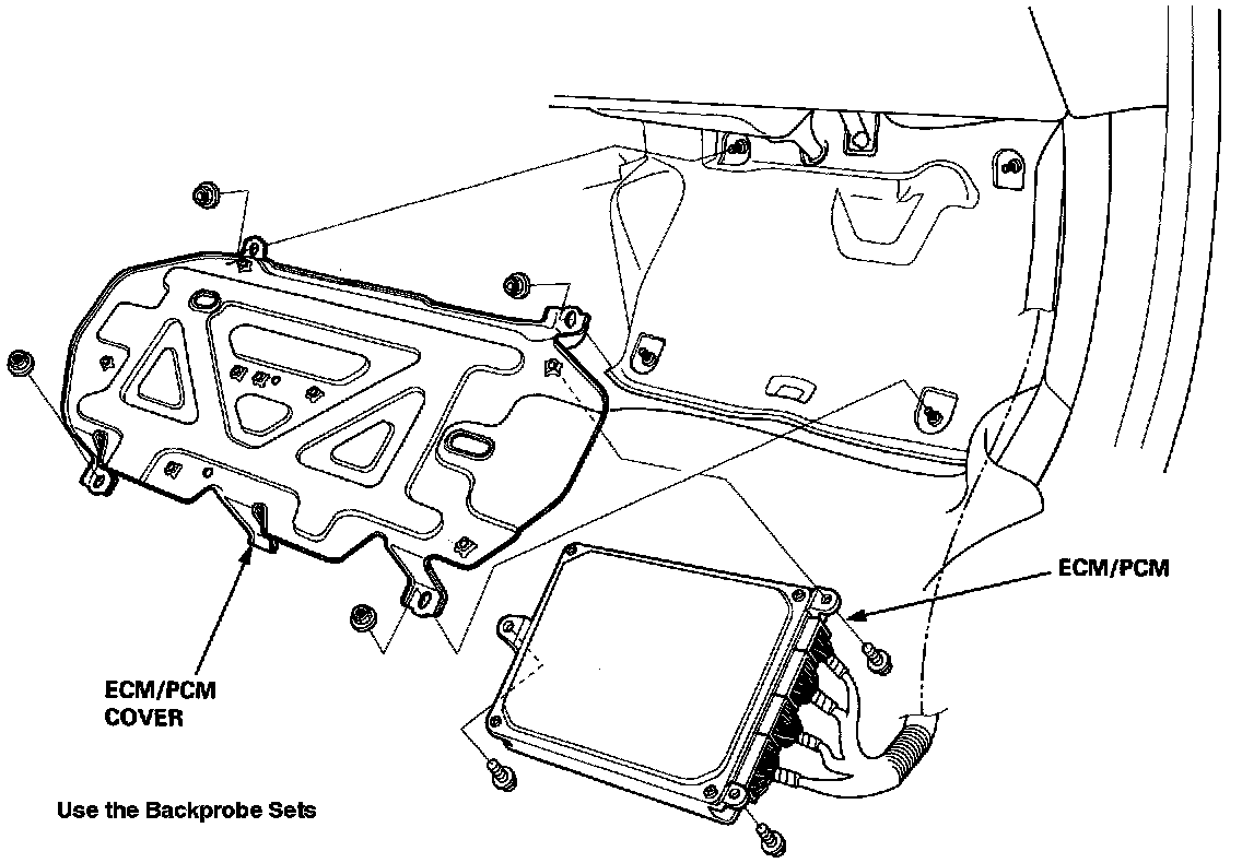 If the inspection for a particular code requires voltage or resistance checks at the ECM/PCM connectors, remove the right door sill molding. Pull the carpet back to expose the ECM/PCM. Unbolt the ECM/PCM cover, and connect the backprobe sets and a digital multimeter as described below. Check the system according to the procedure described for the appropriate code(s). Refer to Diagnostic Charts/Trouble Code Charts.