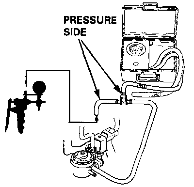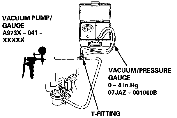 1. Remove the fuel fill cap.2. Remove the vapor line from the EVAP two way valve (located above the EVAP control canister) and connect to a T4itting from vacuum gauge and vacuum pump as shown.