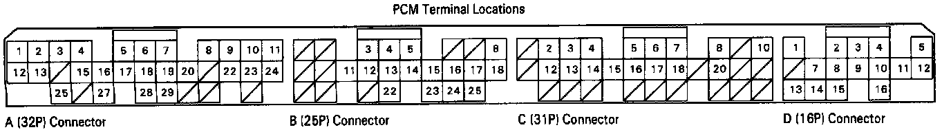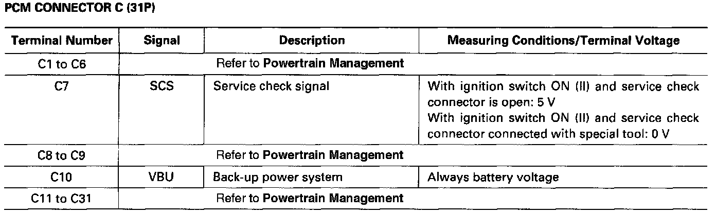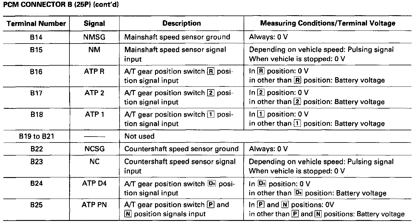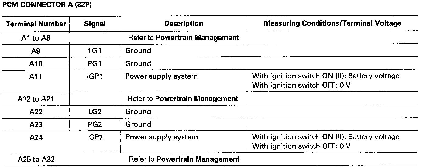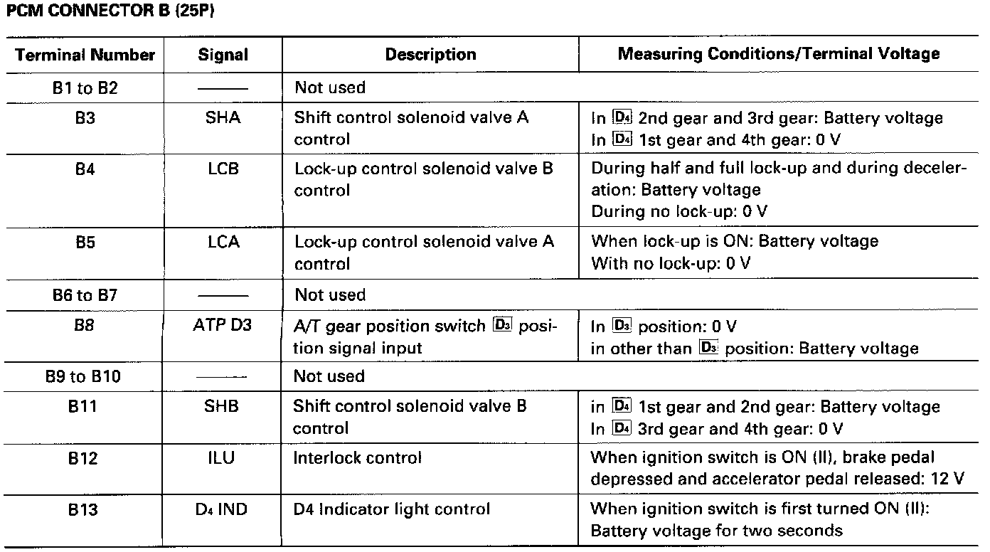 The PCM terminal voltage and measuring conditions are shown for the connector terminals that are related to the A/T control system. The other PCM terminal voltage and measuring conditions are described in Powertrain Management.