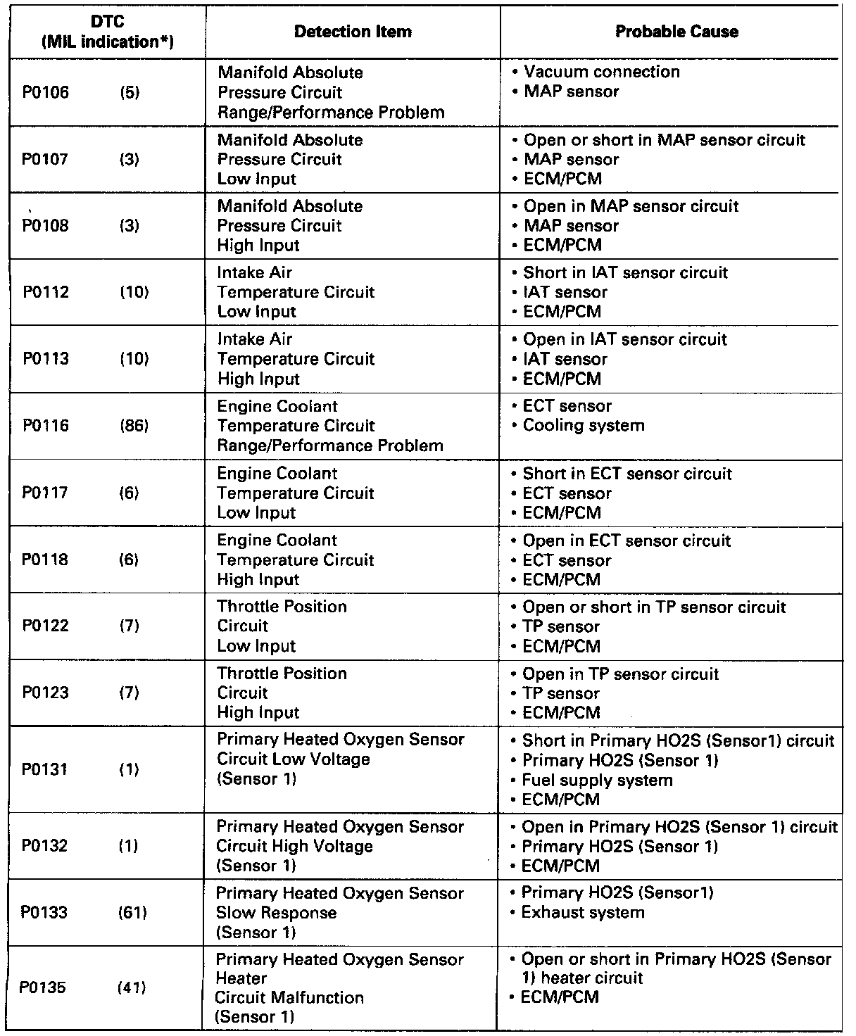 Codes P0106 Thru P0135 (1, 3, 5, 6, 7, 10, 41, 61, 86)*: These DTCs will be indicated by the blinking of the Malfunction Indicator Lamp (MIL) with the SCS service connector connected